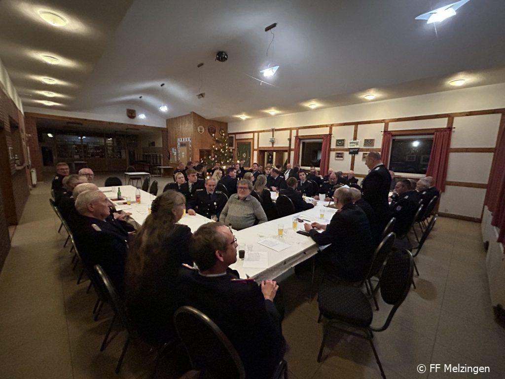 Am Freitag, den 03.01.2025, eröffnete der Ortsbrandmeister Sascha Gerlach um 19:30 Uhr die alljährliche Jahreshauptversammlung des Freundeskreises der FFw Melzingen sowie die 128. Generalversammlung der Freiwilligen Feuerwehr Melzingen. Nach der Begrüßung der Gäste, der fördernden Mitglieder, der Altersabteilung und der Mitglieder der Einsatzabteilung erfolgten zuerst die Formalien des Freundeskreises. Diese umfassten den Kassenbericht des Kassenführers, den Bericht der Kassenprüfer sowie die Neuwahl eines Kassenprüfers. Neuer Kassenprüfer wurde Tim Schroeter. Nach dem Gedenken der verstorbenen Mitglieder und der Verlesung des Protokolls der letzten Generalversammlung erfolgte dann zunächst eine Stärkung mit einem zünftigen Abendessen, das von einigen Frauen der Kameraden gereicht wurde. Dafür hier noch einmal einen herzlichsten Dank.