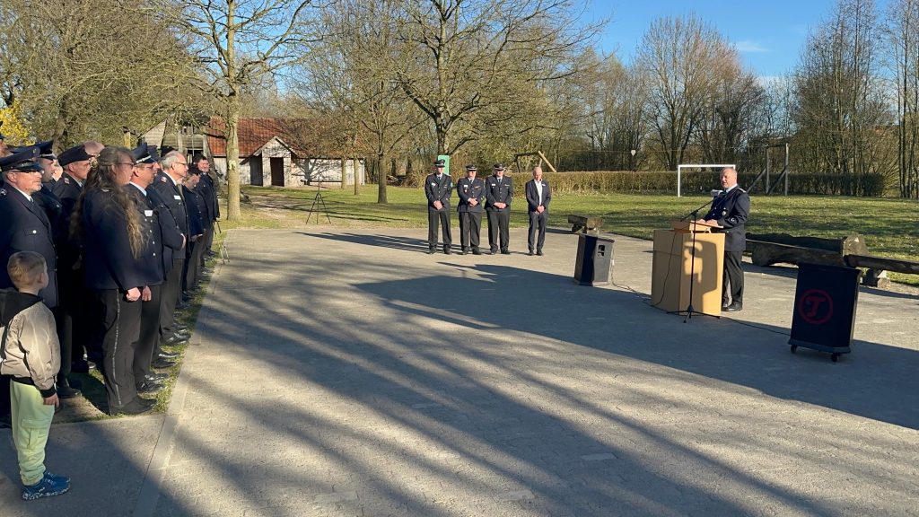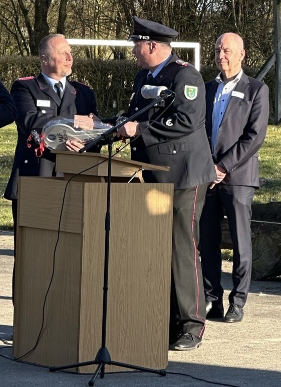 Auch Samtgemeindebürgermeister Martin Feller hielt eine kurze Ansprache und übergab danach den symbolischen Schlüssel an den Gemeindebrandmeister Sven Lühr. Dieser reichte den Schlüssel nach ein paar Worten an den Ortsbrandmeister Sascha Gerlach weiter, welcher sich bei der Samtgemeinde bedankte. Außerdem sprach er den Fördermitgliedern Hans-Joachim Holz und Anke Butenschön seinen Dank für den Symbolschlüssel aus, die diesen in mühsamer Handarbeit gefertigt hatten.