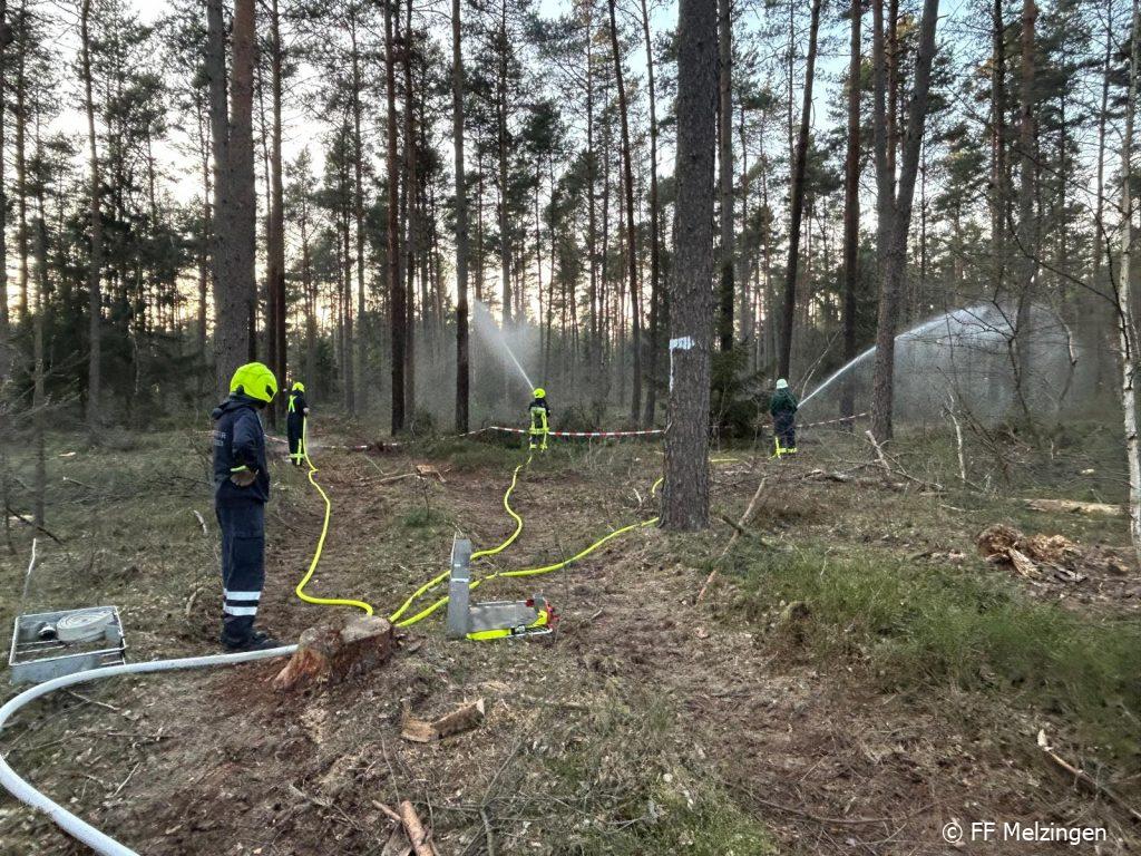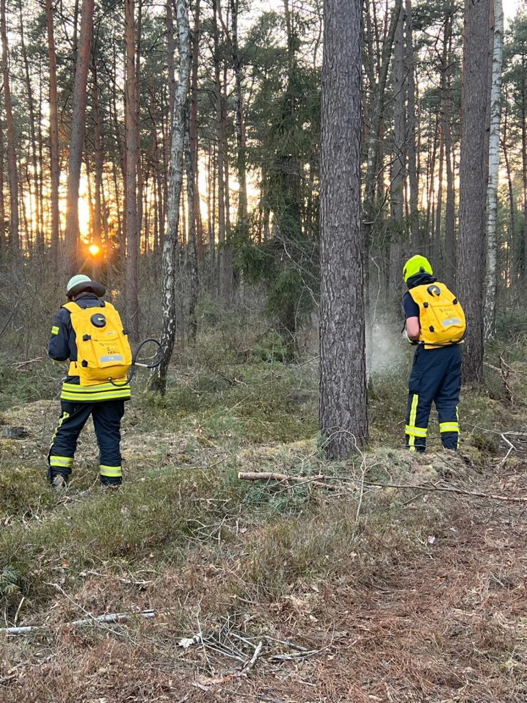 Ein Kamerad wurde mit der Wärmebildkamera ausgestattet, um Glutnester aufzuspüren. Nachdem er welche gefunden hatte, gingen zwei Trupps mit Löschrucksack und Gorgui-Tool (Waldbrandhacke) los und löschten die Glutnester ab.